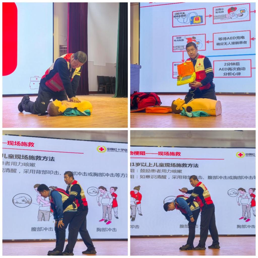 培训过程中,周建华以《常见急症及外伤的现场处理》为题,凭借丰富的实践经验和深厚的专业知识,带来了一场内容丰富、实用性强的培训课程。培训内容采用“理论+实操”相结合的方式展开,讲解了急救基本知识、常见急救场景的识别与应对,并对心肺复苏(CPR)及自动体外除颤器(AED)使用操作要点、气道异物梗阻等实用急救技能进行了演示。